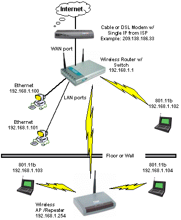 Im unteren Teil der Bilder ("Remote Seite") des Netzes sollten Switches gegenüber Hubs bevorzugt werden. Da in den meisten Fällen die Default-Route der angeschlossenen Komponenten auf den (Wireless) Router zeigen wird, hat der Switch einen gewaltigen Vorteil. Da dieser eine gewisse "Intelligenz" besitzt, werden Daten von Ethernet-Clients die an diesem Switch hängen mit voller Ethernet-Geschwindigkeit direkt von Rechner zu Rechner übertragen. Mit einem Hub würden dieselben Daten erst den Umweg über den Router und somit über das langsame Funknetz gehen.